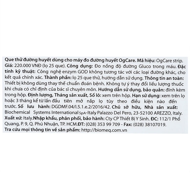 Que thử đường huyết Ogcare được sản xuất bởi Biochemical Systems International.