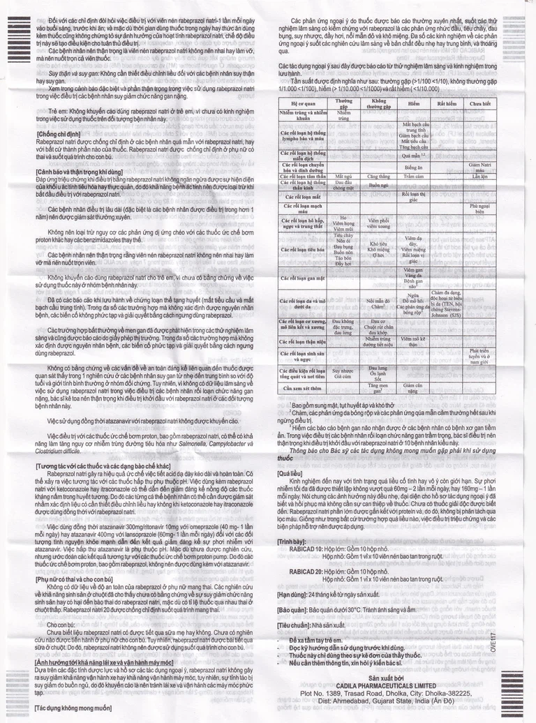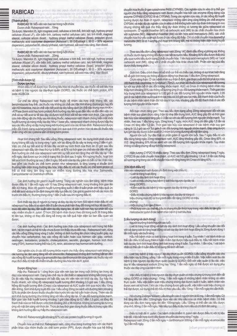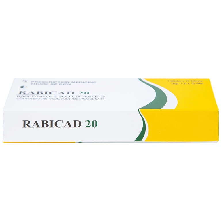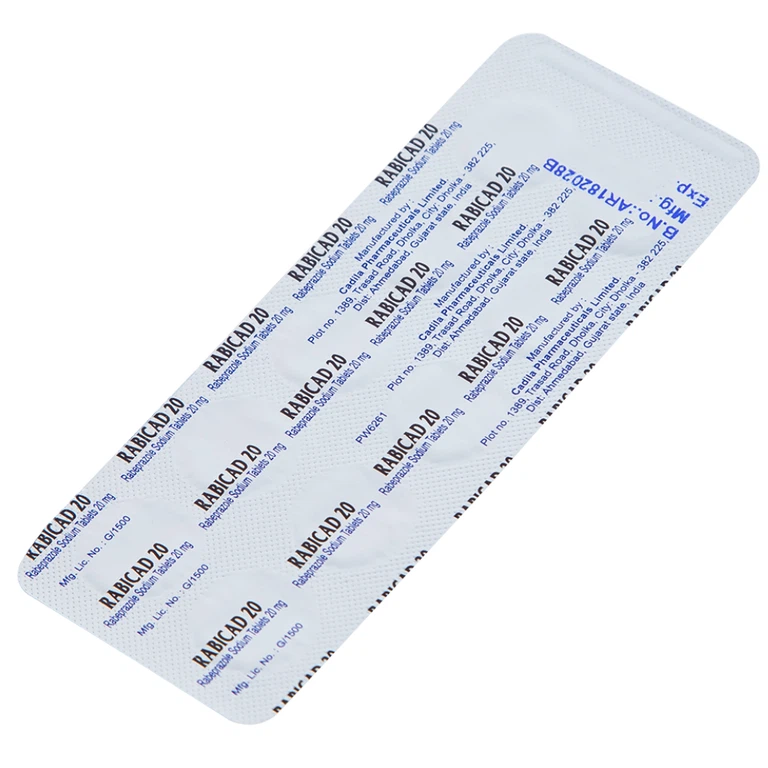 Thuốc Rabicad 20 của công ty Cadila Pharmaceuticals Limited, thành phần chính chứa rabeprazole, là thuốc dùng để trị viêm loét dạ dày tá tràng. Rabicad 20 được bào chế dưới dạng viên nén bao tan trong ruột, hộp lớn gồm 10 hộp nhỏ, hộp nhỏ gồm 1 vỉ x 10 viên nén bao tan trong ruột.