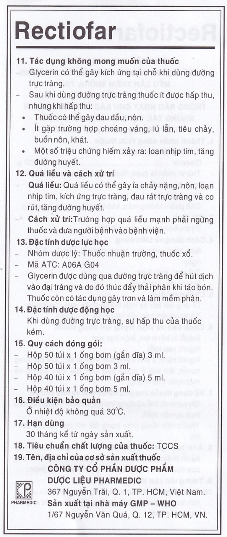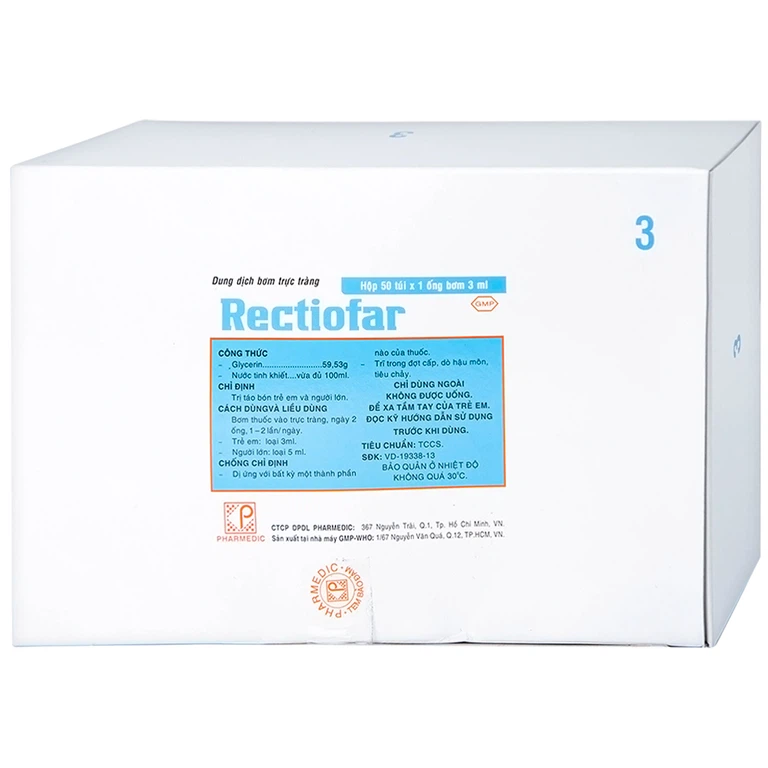 Thuốc Rectiofar của Công ty cổ phần dược phẩm dược liệu PHARMEDIC, chứa hoạt chất glycerin ở dạng dung dịch bơm trực tràng để điều trị táo bón ở trẻ em và người lớn.