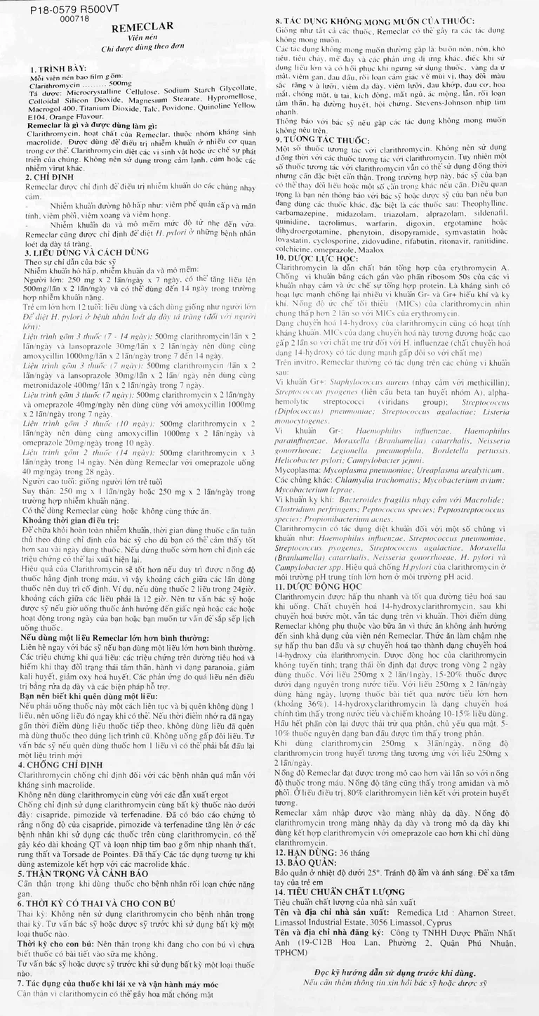 Thuốc Remeclar 500 của Công ty Remedica Ltd, thành phần chính chứa clarithromycin, là thuốc dùng để điều trị nhiễm khuẩn ở nhiều cơ quan trong cơ thể. Remeclar 500 được bào chế dưới dạng viên nén bao phim, hộp 2 vỉ x 7 viên.