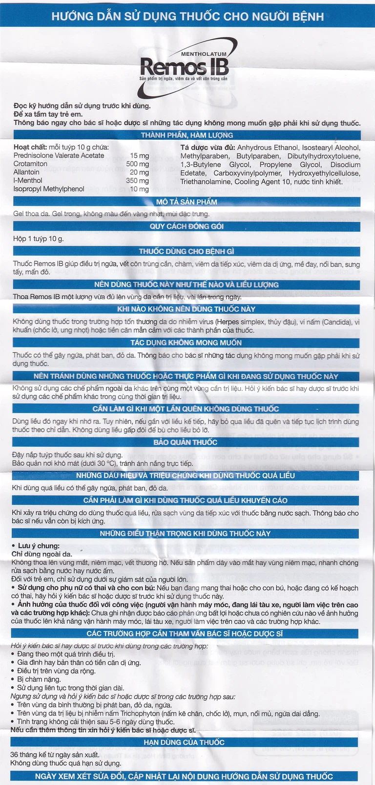 Thoa Remos IB một lượng vừa đủ lên vùng da cần trị liệu, vài lần trong ngày.