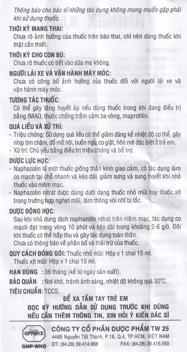 Sau khi nhỏ dung dịch naphazolin nitrat trên niêm mạc, tác dụng co mạch đạt trong vòng 10 phút và kéo dài trong khoảng 2 – 6 giờ. Đôi khi thuốc có thể hấp thu và gây tác dụng toàn thân.