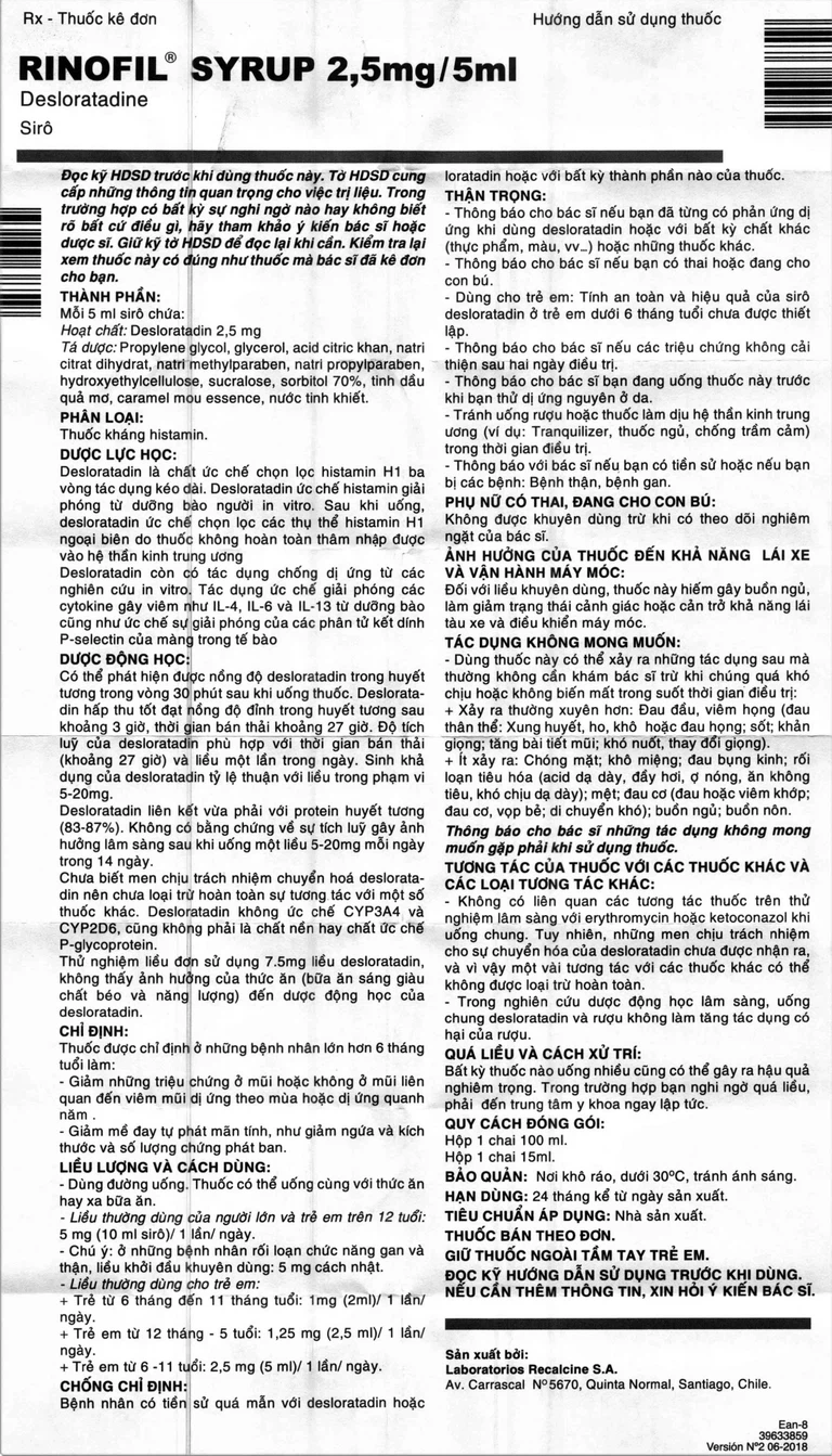 Thuốc Rinofil Syrup 2,5 mg/5 ml chống chỉ định trong các trường hợp bệnh nhân có tiền sử quá mẫn với desloratadin hoặc loratadin hoặc với bất kỳ thành phần nào của thuốc.