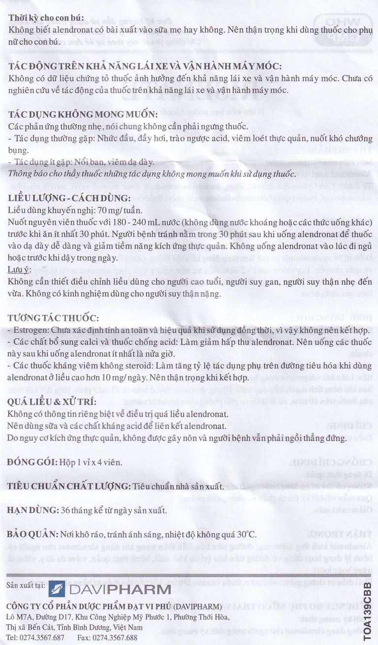 Liều dùng khuyến nghị: 70 mg/ tuần.