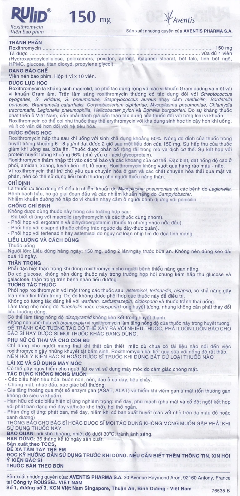 Thuốc Rulid 150mgbào chế dạng viên nén bao phim dùng uống trước bữa ăn.