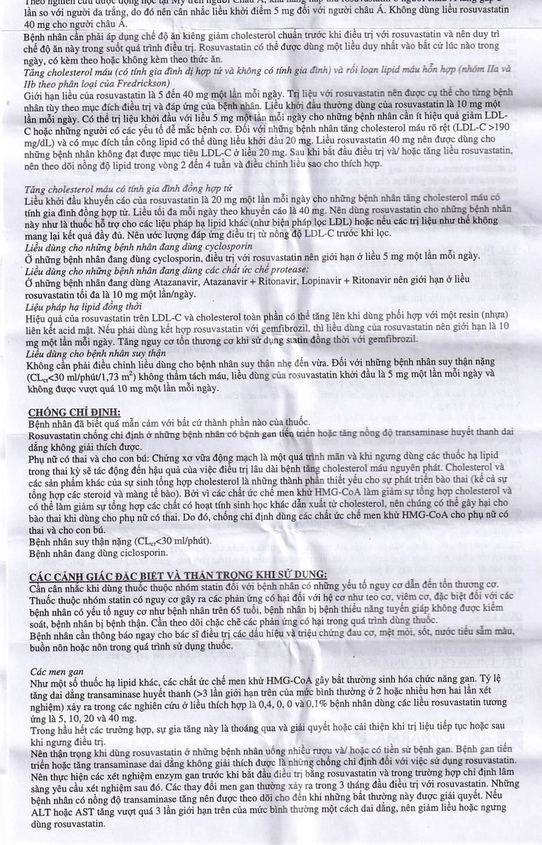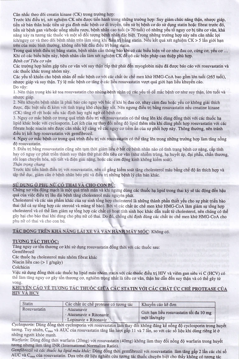 Liên quan giữa liều dùng của rosuvastatin và chứng teo cơ vân cần lưu ý: Tất cả các bệnh nhân bắt đầu điều trị với liều 10 mg/1 lần/ngày và chỉ tăng lên 20 mg nếu thấy cần thiết sau 4 tuần, cần theo dõi chặt chẽ đối với những trường hợp dùng liều 40 mg.