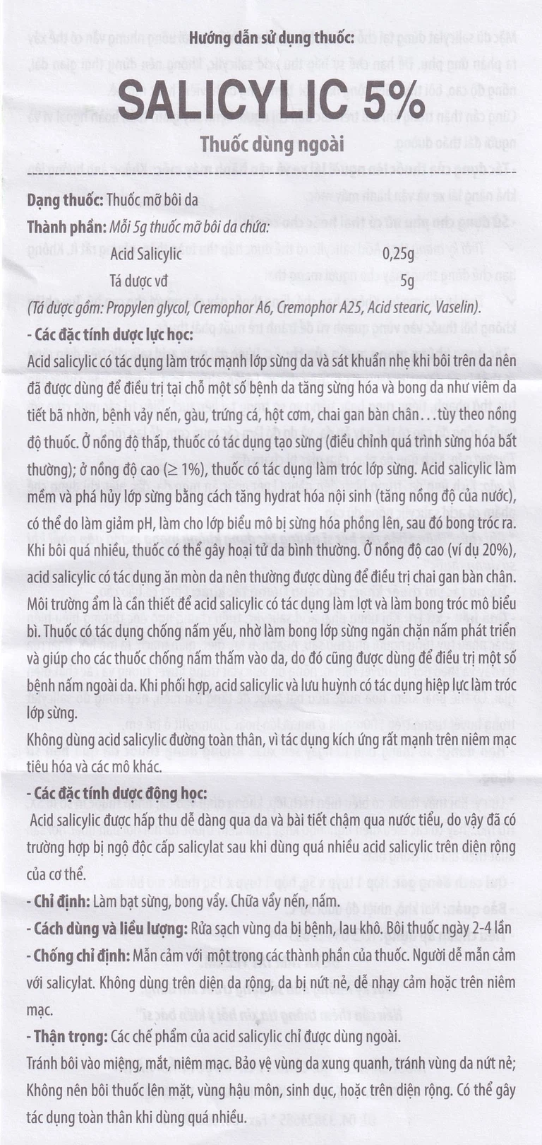 Thuốc mỡ bôi da Salicylic là sản phẩm của Công ty Cổ phần Dược phẩm Hà Tây chứa hoạt chất Acid salicylic. Đây là thuốc được chỉ định làm bạt sừng, bong vẩy, chữa vẩy nến, nấm.