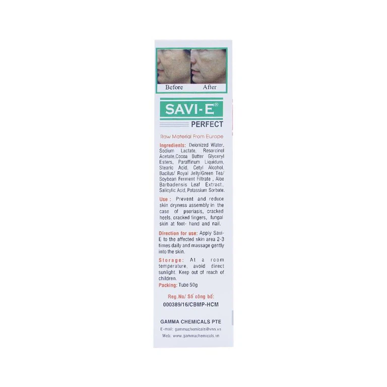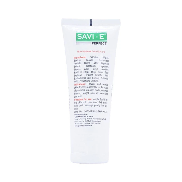 Savi-E Perfect là sản phẩm giúp ngăn ngừa và làm giảm các triệu chứng khô da, nứt nẻ ở gót chân và ngón tay. Kem cũng giúp hỗ trợ điều trị các dạng vảy nến, viêm nang lông, chàm cấp tính và mãn tính, nấm trên da tay, chân, lưng và các nơi khác như mặt, cổ.