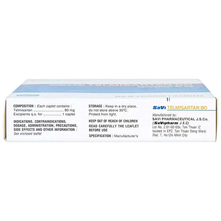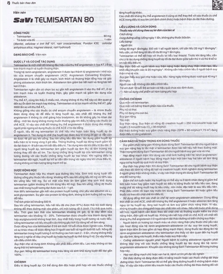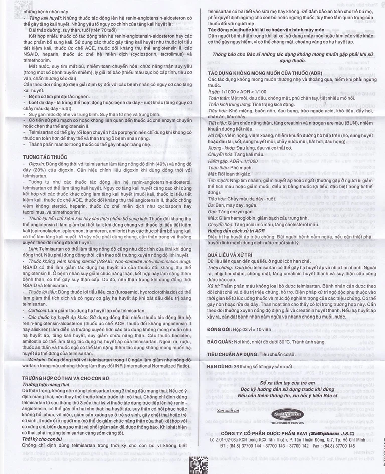 Thuốc Savi Telmisartan của công ty CP dược phẩm Savi, chứa hoạt chất telmisartan được sử dụng để điều trị tăng huyết áp: Có thể dùng đơn độc hoặc phối hợp với các thuốc chống tăng huyết áp khác, phối hợp với thuốc khác điều trị suy tim (chỉ định chính thức) hoặc bệnh thận do đái tháo đường.
