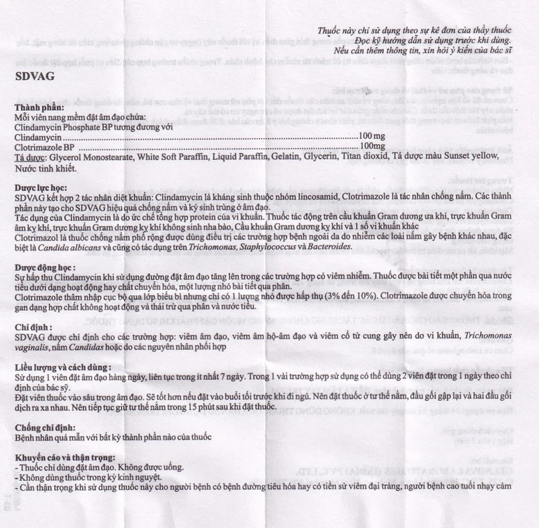 SDVAG kết hợp 2 tác nhân diệt khuẩn: Clindamycin là kháng sinh thuộc nhóm lincosamid, Clotrimazole là tác nhân chống nấm. Các thành phần này tạo cho SDVAG hiệu quả chống nấm và ký sinh trùng ở âm đạo.