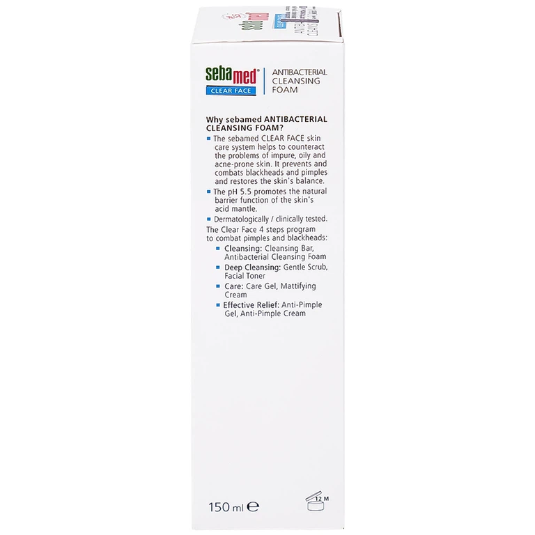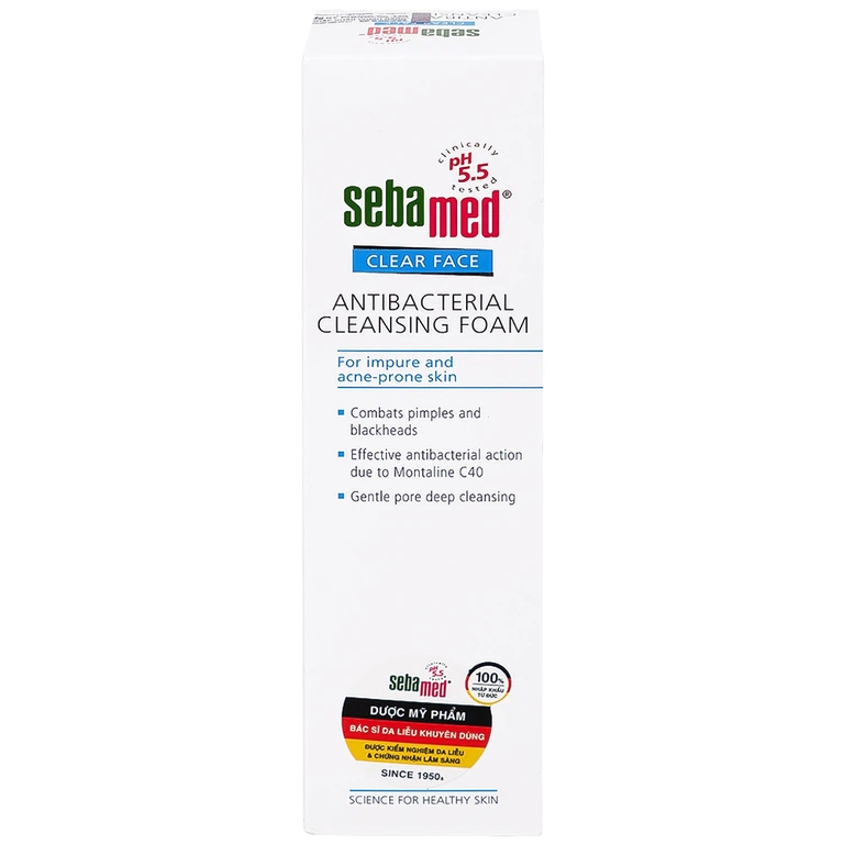 Sebamed Clear Face Antibacterial Cleansing Foam là sữa rửa mặt tạo bọt kháng khuẩn, giảm mụn với độ pH5.5, giúp cân bằng và duy trì lớp acid bảo vệ trên da. Sản phẩm được nhập khẩu trực tiếp tại Đức và đã được kiểm nghiệm da liễu/lâm sàng.