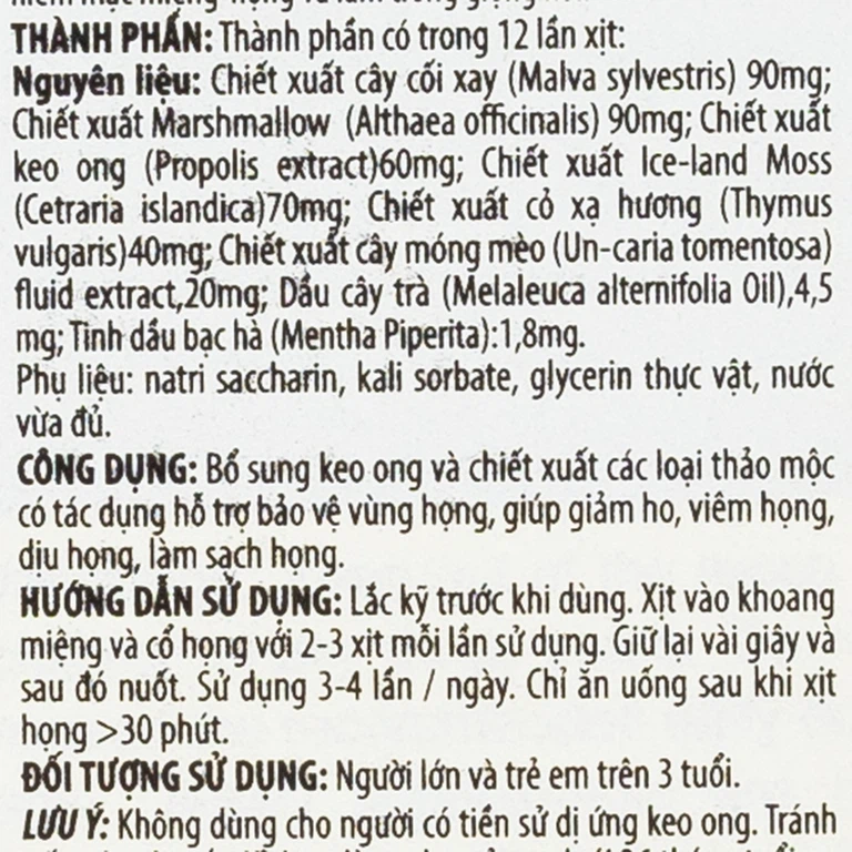 Chiết xuất cây cối xay, Chiết xuất Marshmallow, Chiết xuất Keo ong, Chiết xuất Ice-land Moss, Chiết xuất cỏ xạ hương, Chiết xuất cây móng mèo, Dầu cây trà, Tinh dầu bạc hà