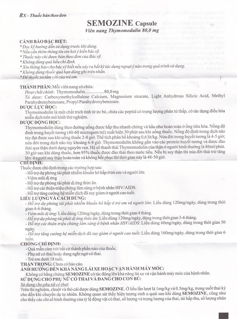 Thuốc Semozine Capsule là thuốc điều hoà miễn dịch có thành phần hoạt chất là thymomodulin hàm lượng 80 mg, được sản xuất bởi công ty Yoo Young Pharmaceutical, Hàn Quốc. Thuốc được chỉ định trong các trường hợp như: Hỗ trợ dự phòng tái phát nhiễm khuẩn hô hấp ở trẻ em và người lớn, viêm mũi dị ứng, hỗ trợ dự phòng tái phát dị ứng thức ăn, hỗ trợ cải thiện triệu chứng lâm sàng ở bệnh nhân HIV/AIDS, hỗ trợ tăng cường hệ miễn dịch đã suy giảm ở người cao tuổi. Thuốc có dạng viên nang, chứa hoạt chất thymomodulin hàm lượng 80 mg.