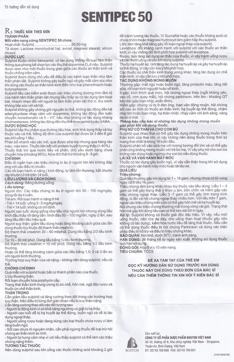 Sentipec 50 của Công ty CPDP Boston Việt Nam, thành phần chính là sulpirid. Thuốc dùng để điều trị ngắn hạn các triệu chứng lo âu ở người lớn khi không đáp ứng với các điều trị chuẩn; điều trị các rối loạn hành vi nặng (kích động, tự làm tổn thương, bắt chước rập khuôn) ở trẻ trên 14 tuổi. Thuốc được bào chế dưới dạng viên nang cứng, mỗi viên chứa 50 mg sulpirid.