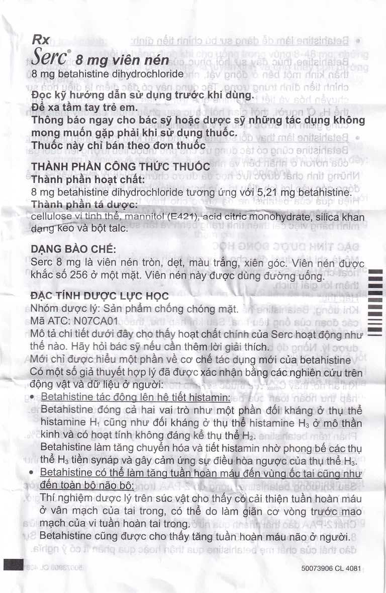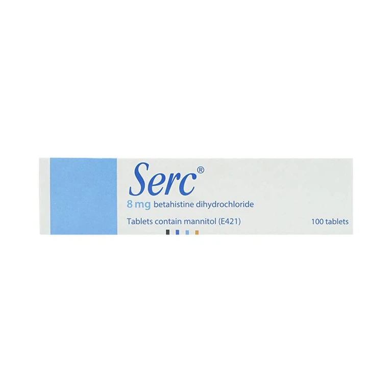 Thuốc Serc 8 mg là viên nén tròn, dẹt, màu trắng, xiên góc. Viên nén được khắc số “256” ở một mặt. Thuốc đóng gói dạng hộp chứa 4 vỉ x 25 viên nén. Serc 8 mg có hoạt chất chính là betahistin dihydrochloride 8 mg có tác dụng chống chóng mặt.
