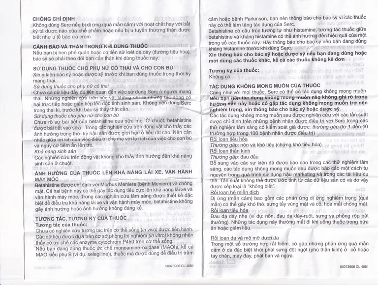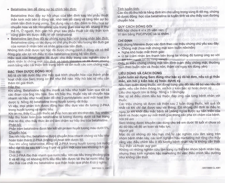 Thuốc Serc Abbott điều trị chóng mặt, mất thính giác, ù tai (4 vỉ x 25 viên)