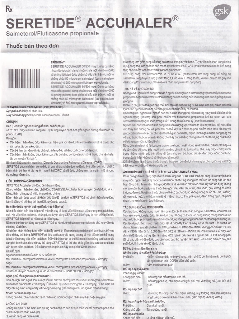 Seretide accuhaler 50/250chỉ dùng để hít qua miệng. Cần cho bệnh nhân biết rằng phải dùng seretide accuhaler 50/250 thường xuyên để đạt được lợi ích tối ưu, thậm chí ngay cả khi không có triệu chứng.