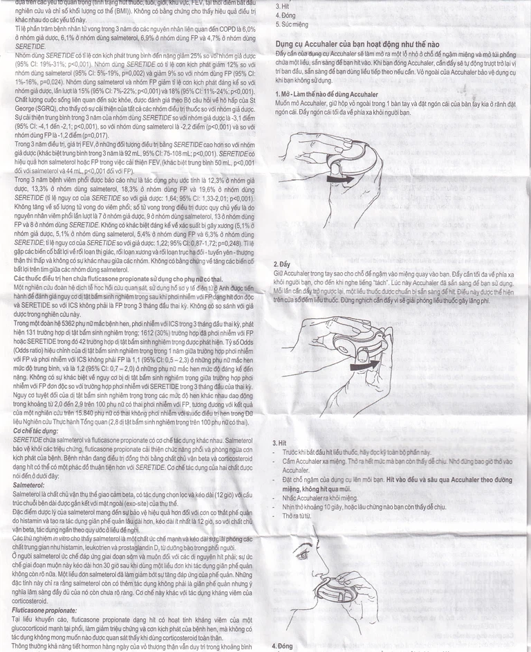 Đẩy cần của dụng cụ Accuhaler sẽ làm mở ra một lỗ nhỏ ở chỗ để ngậm miệng và mà túi phổng chứa một liều, sẵn sàng để bạn hít vào. Khi bạn đóng Accuhaler, cần đầy sẽ tự động trượt trở lại vị trí ban đầu, sẵn sàng để bạn dùng liều tiếp theo nếu cần. Vỏ ngoài của Accuhaler bảo vệ dụng cụ khi bạn không sử dụng.
