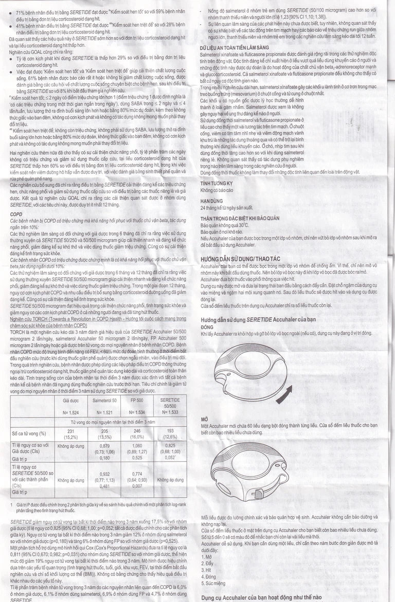 Seretide accuhaler 50/250 được chỉ định trong điều trị duy trì tắc nghẽn đường dẫn khí và giảm cơn kịch phát ở bệnh nhân bệnh phổi tắc nghẽn mạn tinh (COPD) và đã được chứng minh làm giảm tỷ lệ tử vong do mọi nguyên nhân.