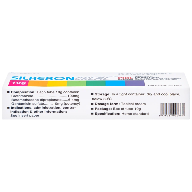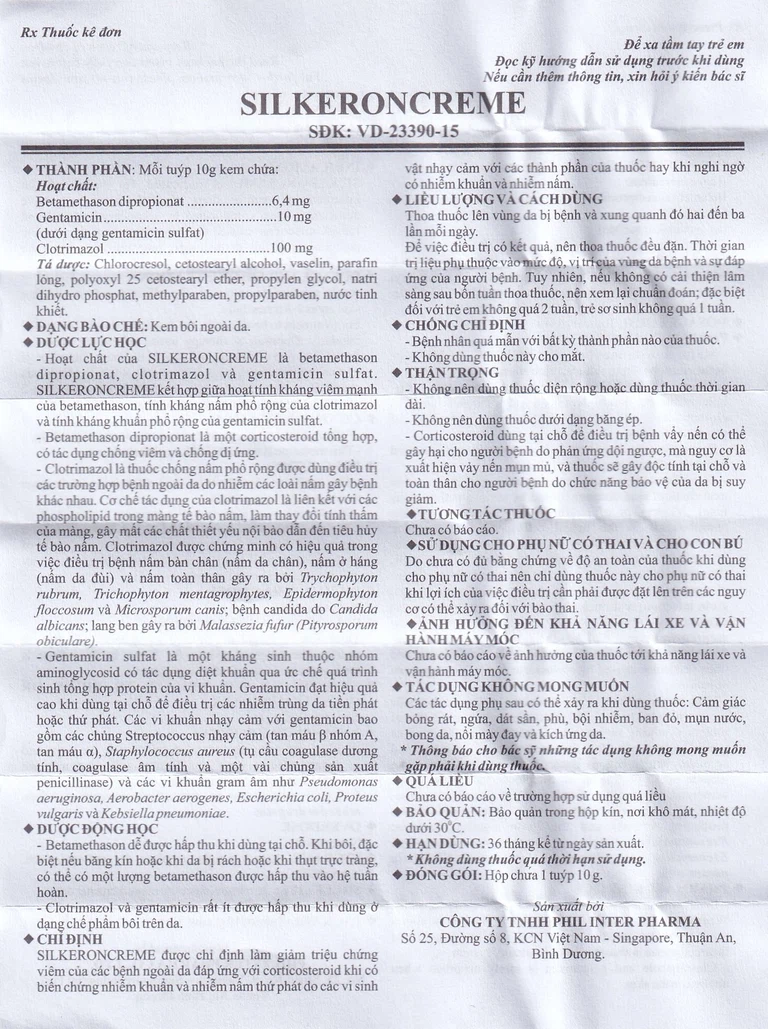 SILKERONCREME của Công ty TNHH PHIL Inter Pharma, thành phần chính là betamethason dipropionat, gentamicin, clotrimazol. SILKERONCREME là thuốc làm giảm triệu chứng viêm của các bệnh ngoài da đáp ứng với corticosteroid khi có biến chứng nhiễm khuẩn và nhiễm nấm thứ phát hay khi nghi ngờ có nhiễm khuẩn và nhiễm nấm. SILKERONCREME được bào chế dưới dạng kem bôi ngoài da, đóng gói theo quy cách hộp chứa 1 tuýp 10 g.