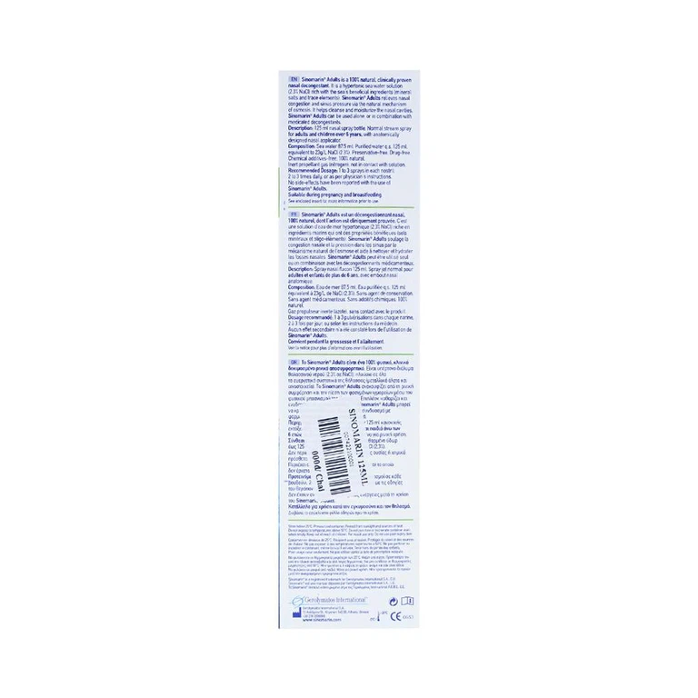 Sinomarin Adults Nose Care hoạt động một mình một cách an toàn và hiệu quả hoặc kết hợp với các phương pháp điều trị bằng thuốc, để giúp cải thiện hiệu quả điều trị tổng thể. Sinomarin là sản phẩm có chứng nhận CE phù hợp với các yêu cầu trong chỉ thị 93/42 của liên minh châu Âu. Sinomarin được đăng ký nhãn hiệu cho Gerolymatos International S.A., Hy Lạp.