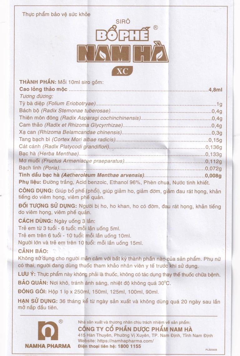 Siro Bổ Phế Nam Hà XC có thành phần hoàn toàn từ các dược liệu tự nhiên, thích hợp dùng cho người bị ho, ho khan, ho có đờm, đau rát họng, khản tiếng do viêm họng, viêm phế quản và dùng được cho trẻ từ 3 tuổi trở lên. Siro Bổ Phế Nam Hà XC có màu nâu vàng hoặc màu nâu, vị ngọt, có mùi thơm của dược liệu.
