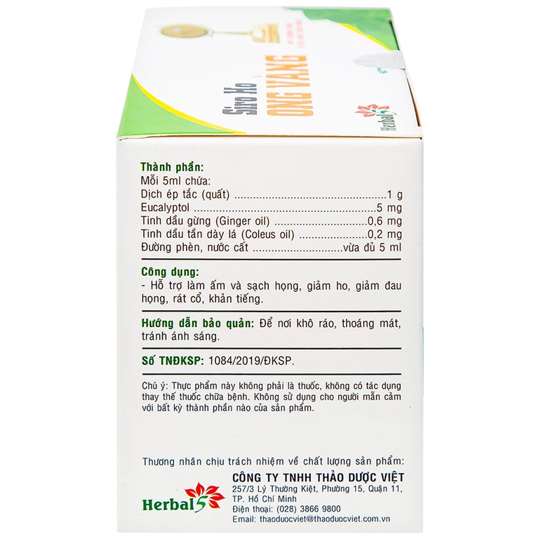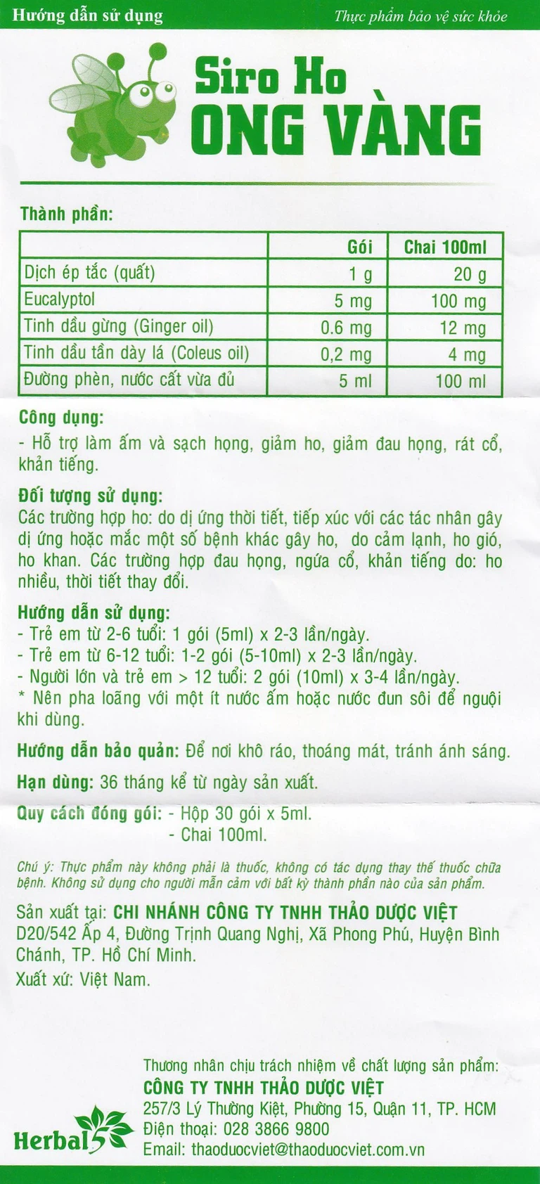 Siro ho Ong Vàng Thảo Dược Việt hỗ trợ làm ấm và sạch họng, giảm ho (30 gói x 5ml)