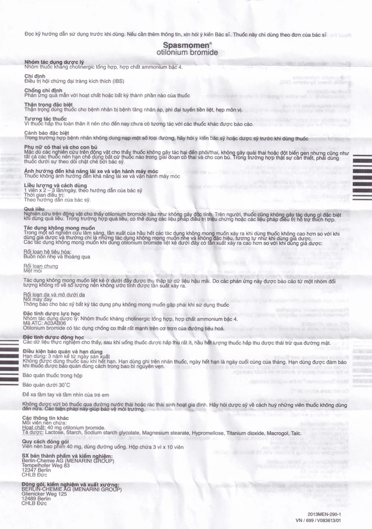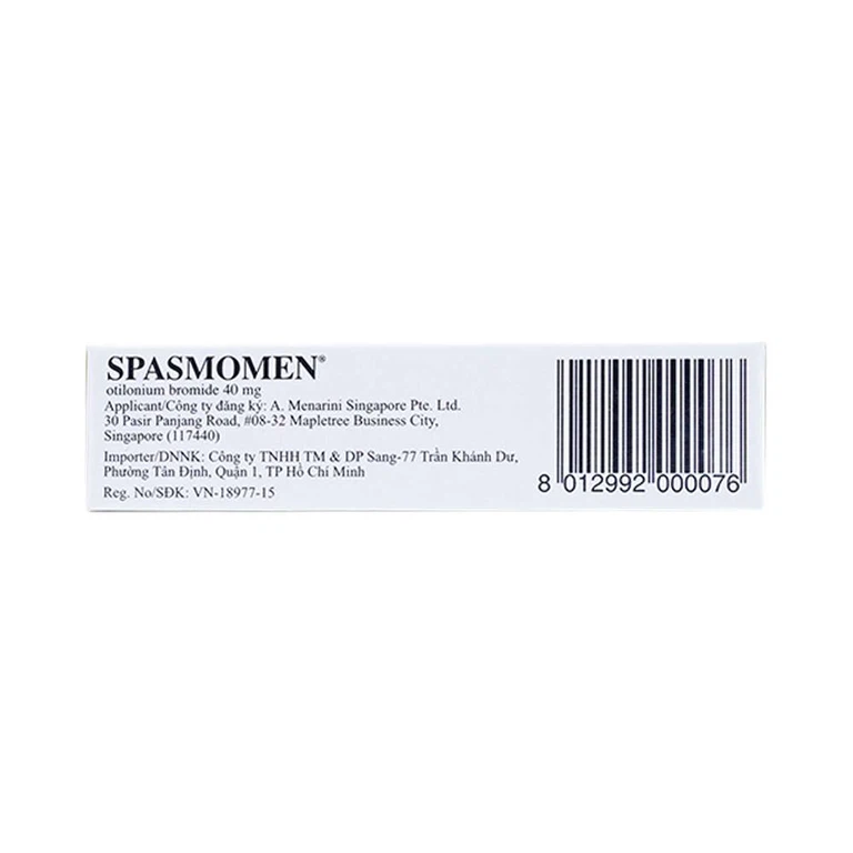 Thuốc Spasmomen 40mg là sản phẩm của Berlin-Chemie AG (Menarini Group) thành phần chính Otilonium Bromide, là thuốc kháng cholinergic tổng hợp được sử dụng để điều trị hội chứng đại tràng kích thích (IBS).