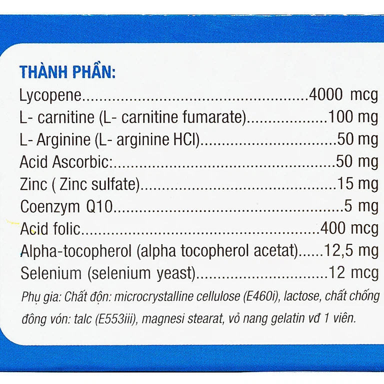 Acid ascorbic, Alpha tocopherol:Bảo vệ sức khỏe tinh trùng, tăng cường hệ miễn dịch.