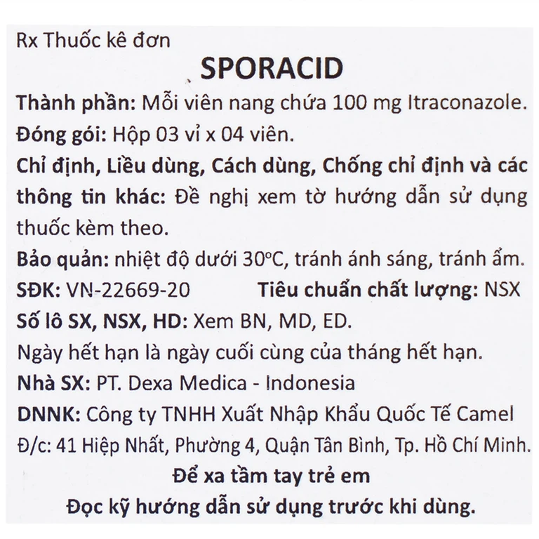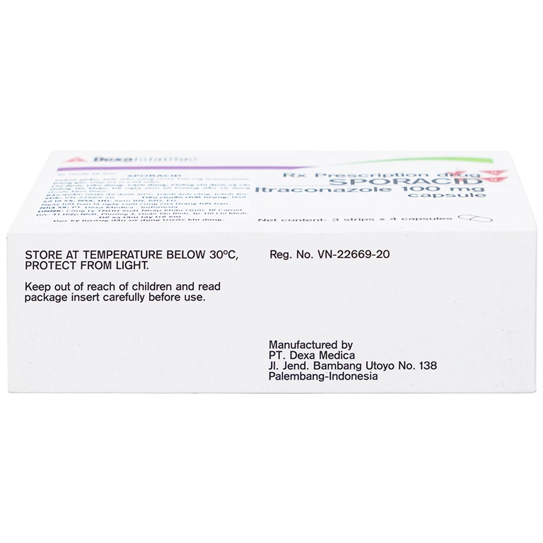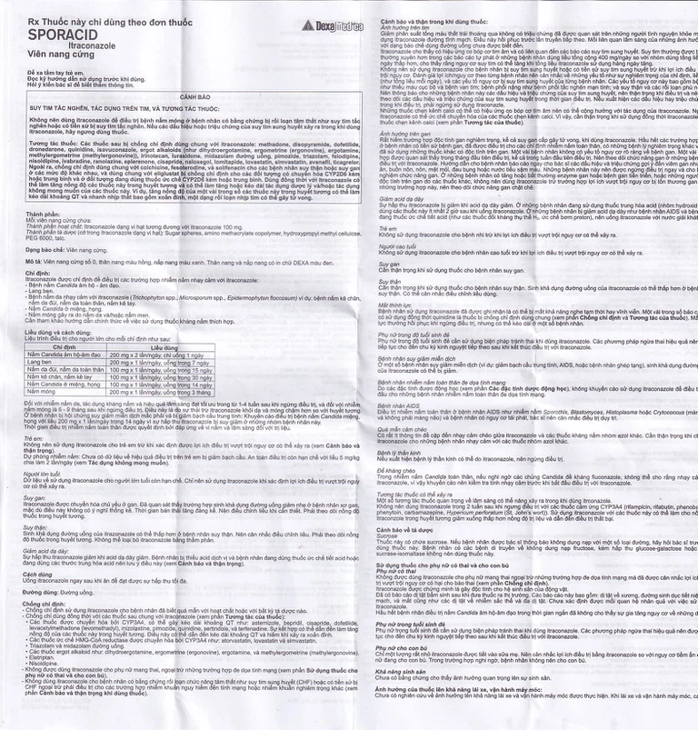 Sporacid được sản xuất bởi PT Dexa Medica, với thành phần chính itraconazole, là thuốc dùng để điều trị nấm Candida âm hộ, âm đạo, lang ben, nấm da, viêm giác mạc do nấm và nấm Candida miệng.