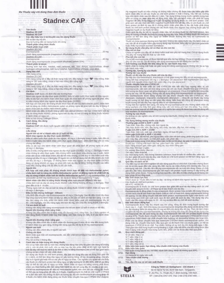Stadnex 20 CAP là sản phẩm của Công ty trách nhiệm hữu hạn Liên doanh Stellapharm (Việt Nam), thành phần chính của thuốc là esomeprazole. Thuốc dùng để điều trị bệnh trào ngược dạ dày – thực quản, loét dạ dày do dùng NSAID và loét tá tràng do vi khuẩn Helicobacter pylori. Ngoài ra, Stadnex 20 CAP còn được sử dụng để điều trị hội chứng Zollinger – Ellison.