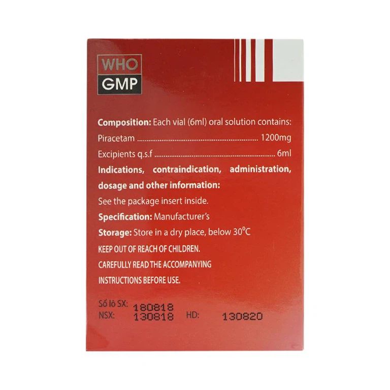 Piracetam dùng theo đường uống được hấp thu nhanh chóng và hầu như hoàn toàn ở ống tiêu hóa. Khả dụng sinh học gần 100%. Nồng độ đỉnh trong huyết tương (40 – 60 microgram/ml) xuất hiện 30 phút sau khi uống một liều 2g. Nồng độ đỉnh trong dịch não tủy đạt được sau khi uống thuốc 2 – 8 giờ. Hấp thu thuốc không thay đổi khi điều trị dài ngày.