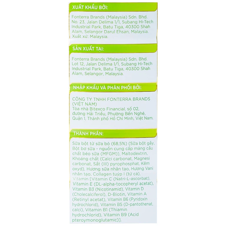 Sữa bột từ sữa bò, Maltodextrin, Khoáng chất, Hương sữa nhân tạo, Hương Vani nhân tạo, Collagen cá, Vitamin C, Vitamin E, Vitamin B3, Vitamin D, D-Biotin, Vitamin A, Vitamin B6, Vitamin B5, Vitamin B1, Vitamin B9