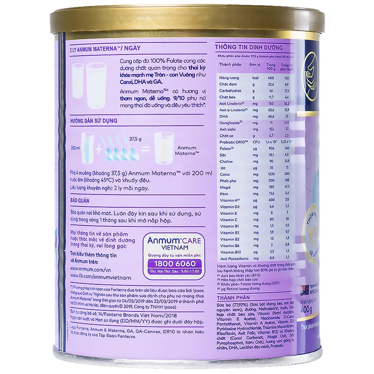 Với 2 ly sữa Anmum Materna mỗi ngày được pha đúng tỷ lệ, mẹ đã bổ sung đầy đủ dưỡng chất thiết yếu. Cung cấp 100% folate cũng các chất như canxi, sắt và hơn 30 loại vitamin và khoáng chất .