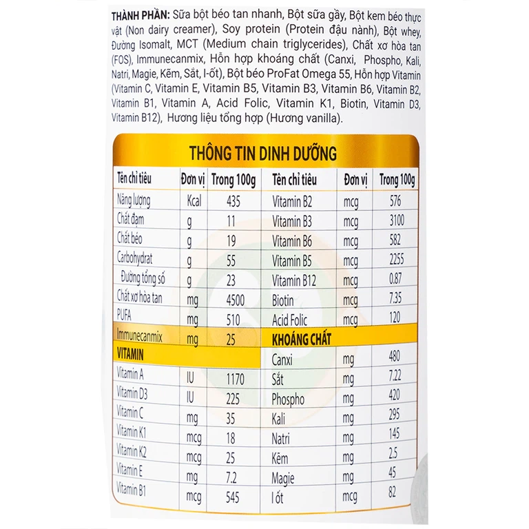 Sữa bột béo, sữa bột gầy, Maltodextrin, Dầu thực vật, Protein đậu nành, Whey protein, Stevia, Isomalt, Đông trùng hạ thảo, Sữa non, Chất xơ dinh dưỡng, Omega 3, Omega 6, Cloride, L-Carnitine, Taurine, Lysine, Hỗn hợp khoáng chất, Hỗn hợp vitamin, Hương vanilla dùng trong thực phẩm