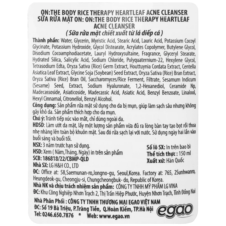 Sữa rửa mặt On: The Body Rice Therapy Heartleaf Acne Cleanser làm sạch sâu không gây khô da (150ml)