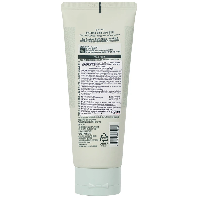Sữa rửa mặt On:The Body Rice Therapy Rice Heartleaf Acne Cleanser là sản phẩm rửa mặt sử dụng cho da bị mụn, giúp làm sạch sâu nhưng không gây khô da. Sản phẩm thích hợp cho da mụn.