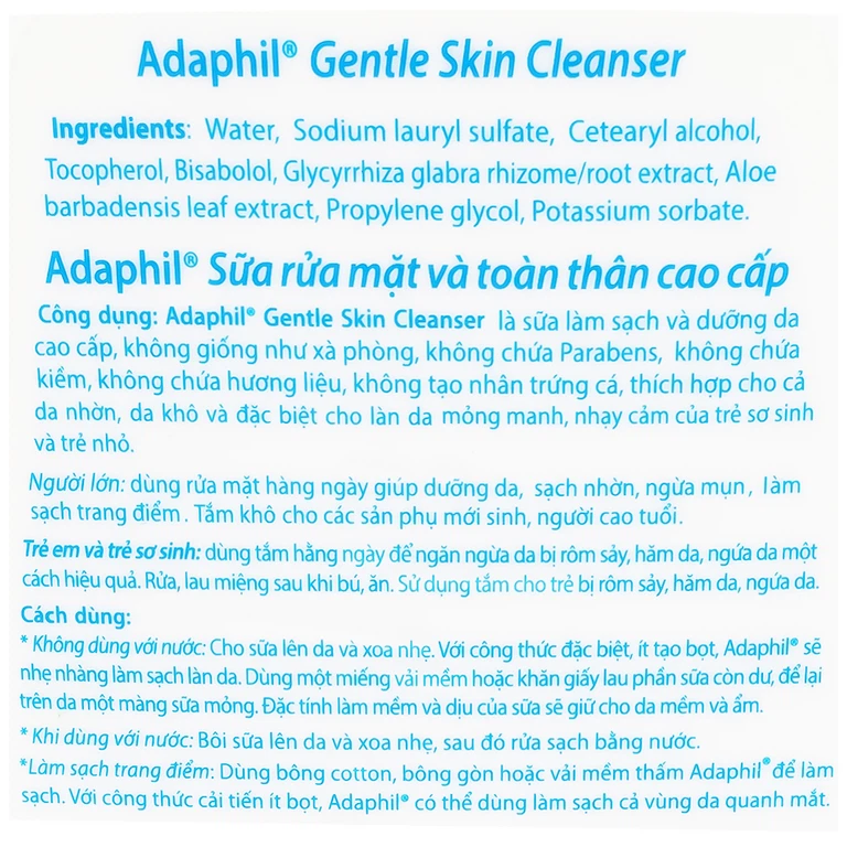 Adaphil Gentle Skin Cleanser là sữa làm sạch và dưỡng da cao cấp, không giống như xà phòng, không chứa Parabens, không chứa kiềm, không chứa hương liệu, không tạo nhân trứng cá, thích hợp cho cả da nhờn, da khô và đặc biệt cho làn da mỏng manh, nhạy cảm của trẻ sơ sinh và trẻ nhỏ.