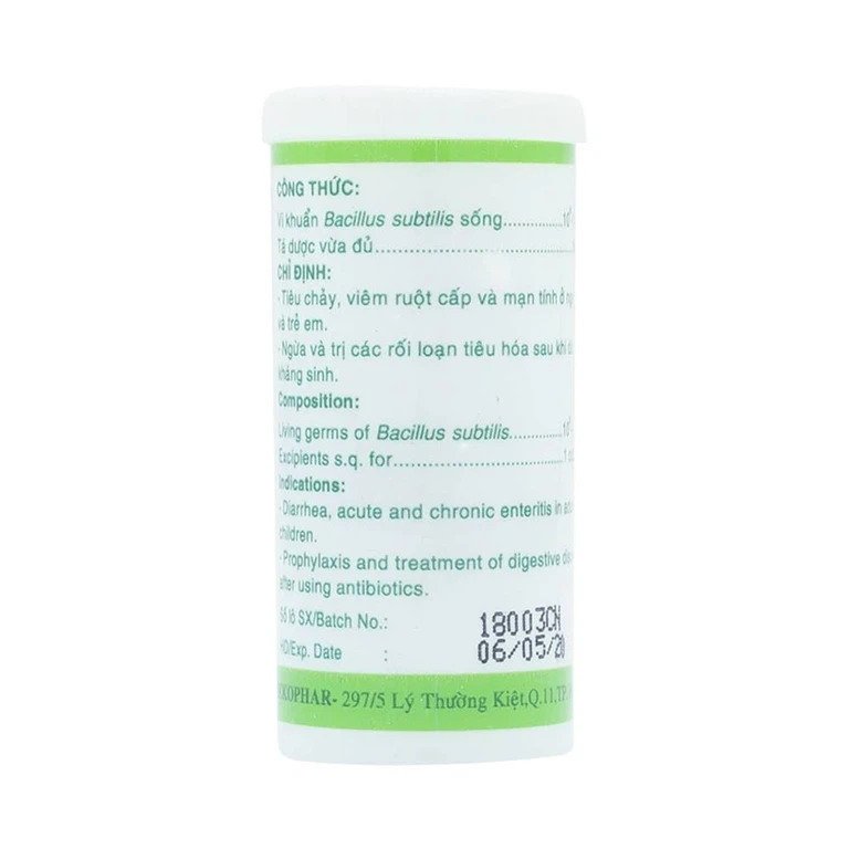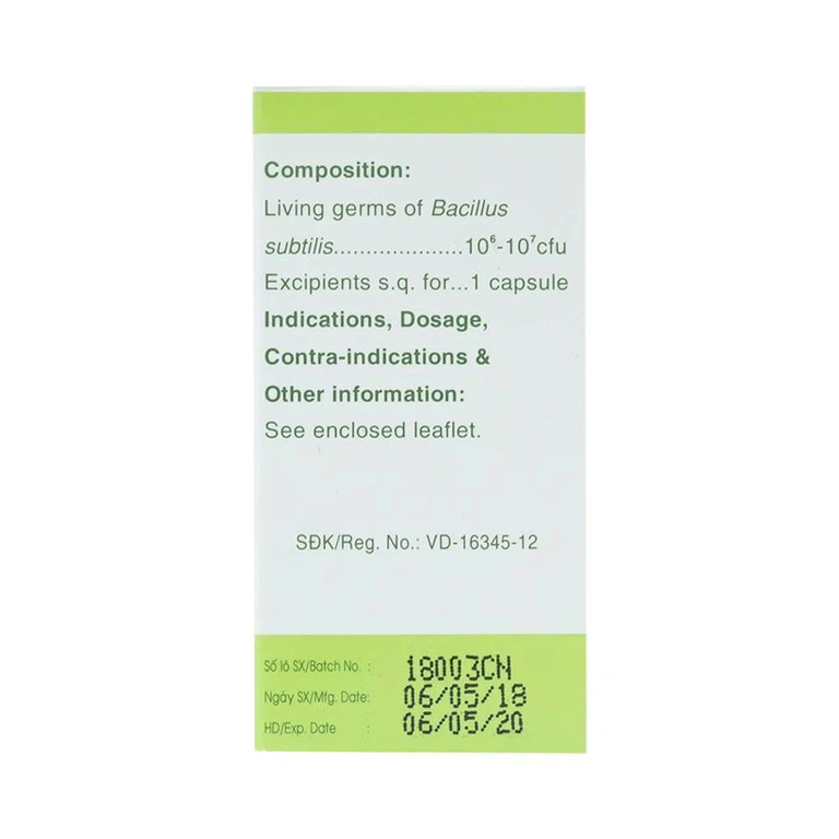 Bacillus subtilistồn tại trong sản phẩm ở trạng thái bào tử, nhờ vậy khi uống vào dạ dày nó không bị acid cũng như các men tiêu hóa ở dịch vị phá hủy. Ở ruột, bào tử nẩy mầm và phát triển thành thể hoạt động giúp cân bằng hệ vi sinh có ích trong đường ruột, cải thiện hệ thống tiêu hóa, nhất là sau khi sử dụng kháng sinh kéo dài.