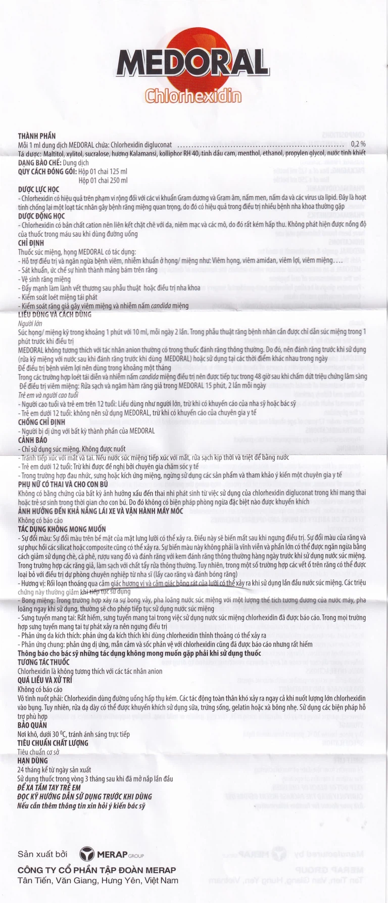 Súc Miệng Họng Medoral Merap của Công ty cổ phần tập đoàn Merap, thành phần chính chlorhexidin digluconat. Thuốc được sử dụng để hỗ trợ điều trị và ngăn ngừa bệnh viêm nhiễm khuẩn ở họng miệng (như viêm họng, viêm amidan, viêm lợi, viêm miệng); sát khuẩn, ức chế sự hình thành mảng bám trên răng; vệ sinh răng miệng; đẩy mạnh làm lành vết thương sau phẫu thuật hoặc điều trị nha khoa; kiểm soát loét miệng tái phát; kiểm soát răng giả gây viêm miệng và nhiễm nấm Candida miệng.