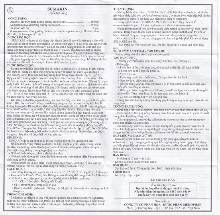 Sumakin là thuốc có tác dụng diệt khuẩn đối với các vi khuẩn nhạy cảm với Amoxicillin , sự phối hợp Amoxicillin với Sulbactam theo tỉ lệ 1:1 giúp cho Amoxicillin không bị beta-lactamase phá hủy. Cơ chế tác dụng của Amoxicillin là ức chế quá trình sinh tổng hợp protein của thành tế bào vi khuẩn, dẫn đến tiêu diệt vi khuẩn. Thuốc có tác dụng diệt khuẩn trong suốt quá trình phân chia của vi khuẩn nhạy cảm.