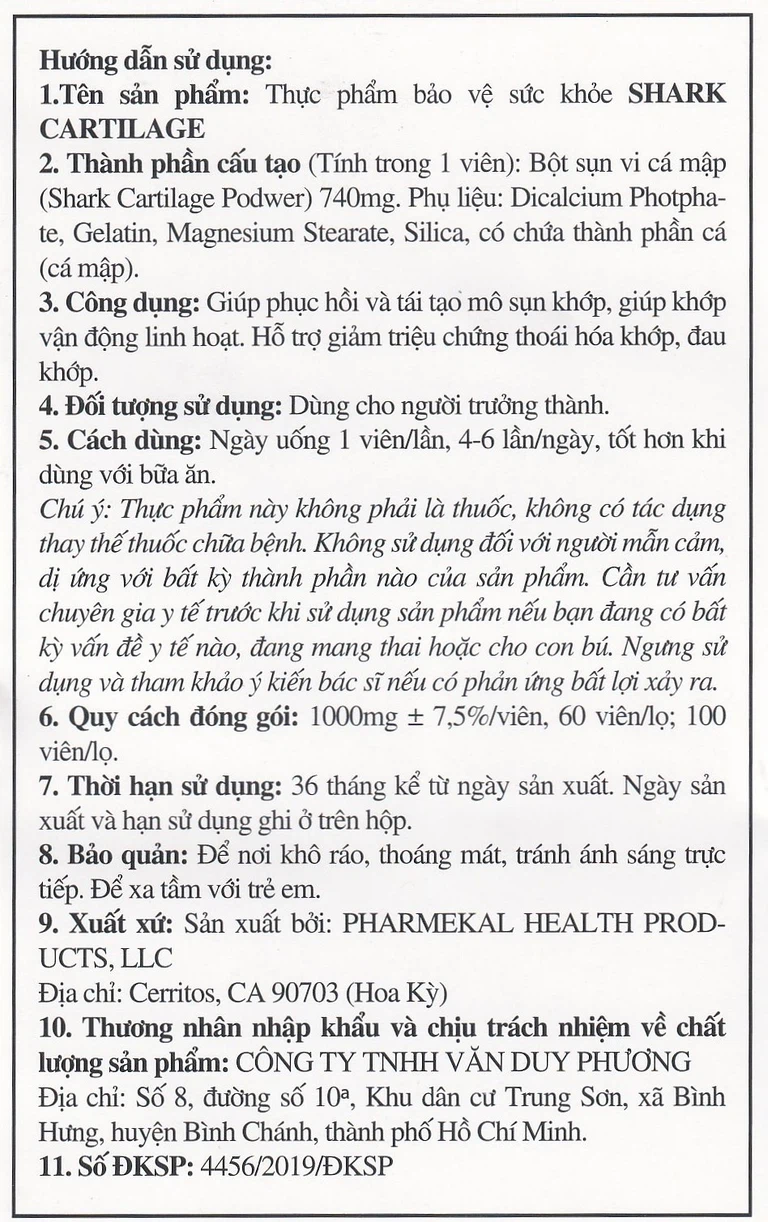 Viên uống Shark Cartilage Pharmekal giúp phục hồi và tái tạo mô sụn khớp (60 viên)
