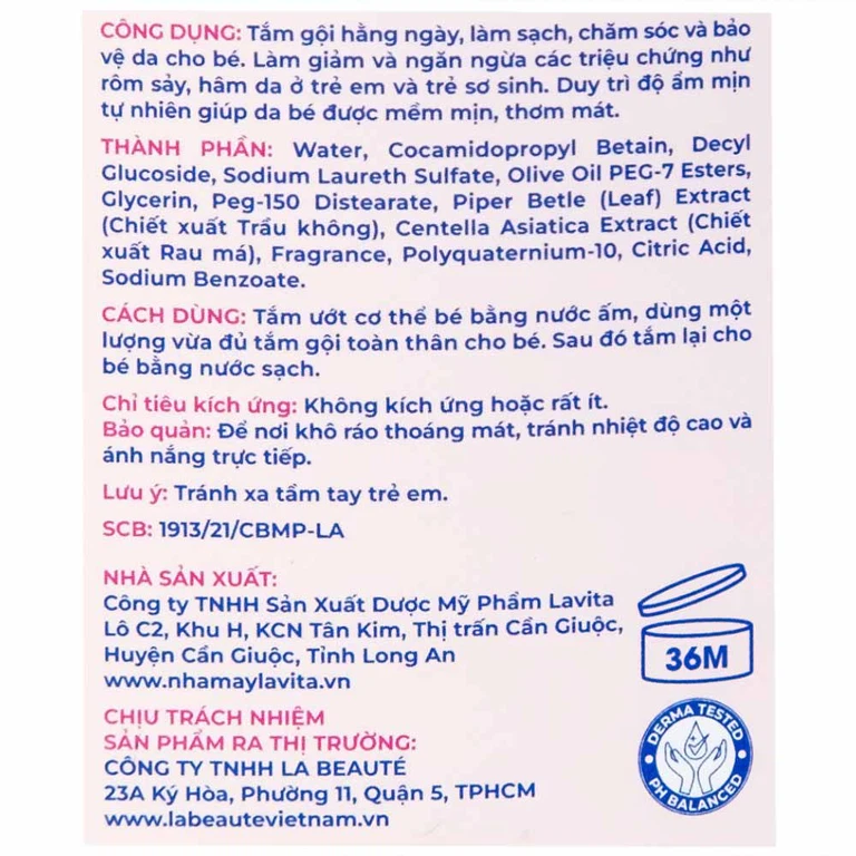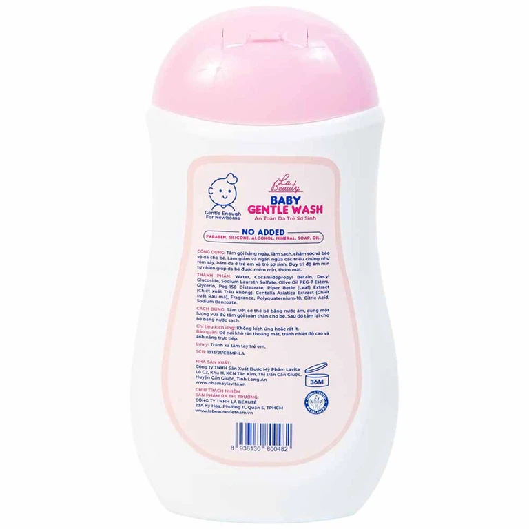Baby Gentle Wash La Beauty 250ml là sản phẩm sữa tắm hằng ngày, giúp làm sạch, chăm sóc và bảo vệ da cho bé. Làm giảm và ngăn ngừa các triệu chứng như rôm sảy, hâm da ở trẻ em và trẻ sơ sinh. Duy trì độ ẩm mịn tự nhiên cho da bé.