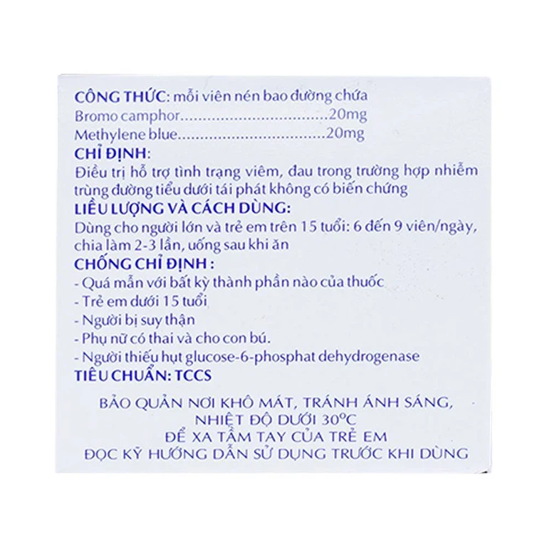Thuốc Tanamisolblue là sản phẩm của Công ty TNHH Sản xuất – Thương mại Dược phẩm Thành Nam, có thành phần chính là methylene blue, bromo camphor. Tanamisolblue được dùng để điều trị hỗ trợ tình trạng viêm, đau trong trường hợp nhiễm trùng đường tiểu dưới tái phát không có biến chứng.