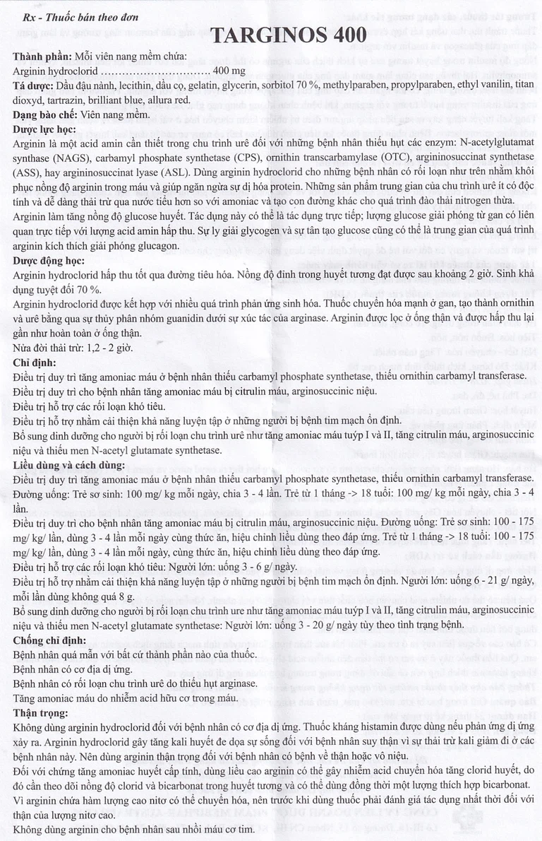 Thuốc “Targinos 400” dùng đường uống. Uống thuốc cùng với thức ăn.