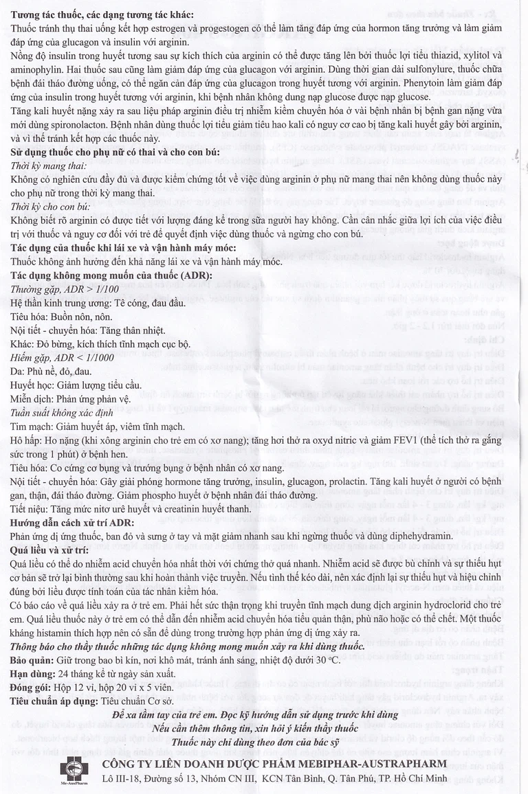 Arginin được lọc ở ống thận và được hấp thu lại gần như hoàn toàn ở ống thận. Nửa đời thải trừ: 1,2 – 2 giờ.
