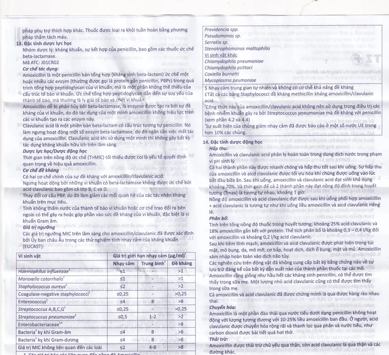 Nồng độ amoxicillin và acid clavulanic đạt được sau khi uống phối hợp amoxicillin + acid clavulanic là tương tự như khi uống liều amoxicillin và aicd clavulanic riêng lẻ.