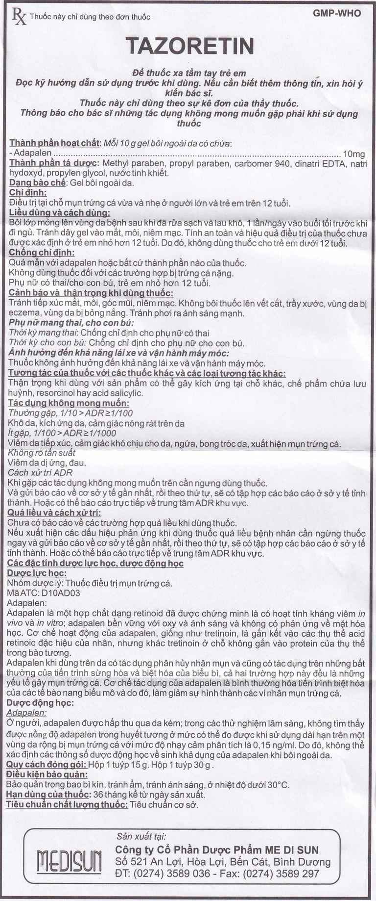 Thuốc bôi da Tazoretin là sản phẩm của Công ty Cổ phần Dược phẩm Me Di Sun, thành phần chính là Adapalen. Tazoretin là thuốc điều trị tại chỗ mụn trứng cá vừa và nhẹ ở người lớn và trẻ em trên 12 tuổi.