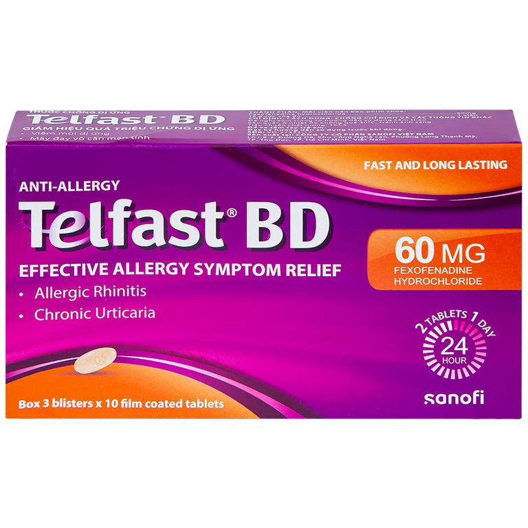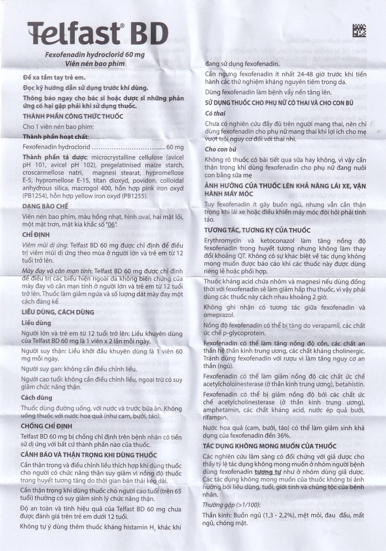 Viêm mũi dị ứng: Telfast BD 60mg được chỉ định để điều trị viêm mũi dị ứng theo mùa ở người lớn và trẻ em từ 12 tuổi trở lên.