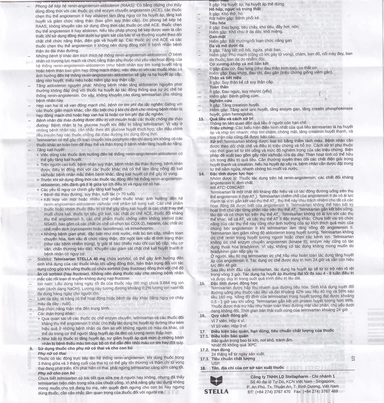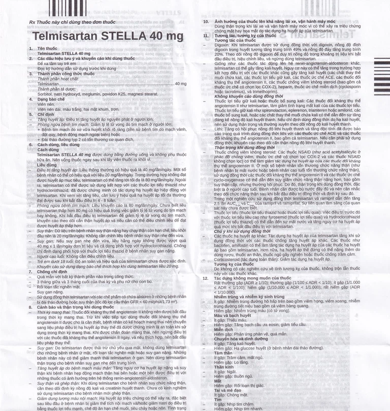 Sorbitol: Telmisartan STELLA 40 mg chứa sorbitol, có thể gây ảnh hưởng đến sinh khả dụng của các thuốc khác khi uống đồng thời. Nên thận trọng đối với tác dụng cộng gộp khi uống thuốc có chứa sorbitol (hay fructose) đồng thời với chế độ ăn có sorbitol (hay fructose). Không nên dùng thuốc này cho những bệnh nhân mắc các rối loạn di truyền không dung nạp fructose.
